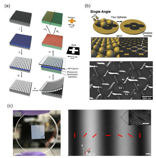 For conventional metasurface fabrication, defining a pattern by using a lithography process is necessary. Recently, Nemiroski et al. proposed a shadow-sphere lithography process to fabricate a nanoantenna [197]. This process can define metasurface patterns in a large area without using any lithography process. A schematic of the shadow-sphere lithography process is shown in Figure 9b. Multiple polystyrene spheres with 1-μm diameter are deposited on the surface of a silicon wafer. The size of polystyrene spheres can be precisely controlled by adjusting the etching time of oxygen plasma etching. The evaporation materials are deposited at the gaps between the spheres during the evaporation process and define the metasurface pattern. The pattern can be controlled by changing the tilt angle of deposition. The authors demonstrated multiple material nanorods with a hexagonal arrangement, as displayed in Figure 9b. Usually, a process of several steps of lithography in sequence is necessary to fabricate this kind of complex structure. Shadow-sphere lithography provides a new strategy for the efficient prototyping and discovery of periodic metasurfaces made with multiple materials. Although this technique is limited in the design of patterns, it is still a good option for the large-area fabrication of metasurfaces.