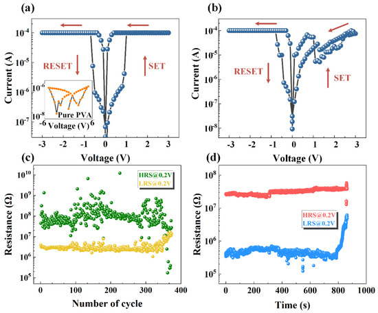 The I–V curve and switching behaviors of (a) Ag/PVA:MoS2/ITO, PVA:MoS2 = 4:1, insect: Ag/PVA/ITO, (b) Ag/PVA:MoS2/ITO, PVA:MoS2 = 4:3. (c) The endurance of PVA:MoS2 = 4:1 RRAM, (d) The resistive-state retention time of HRS and LRS of Ag/PVA:MoS2/ITO, PVA:MoS2 = 4:1.