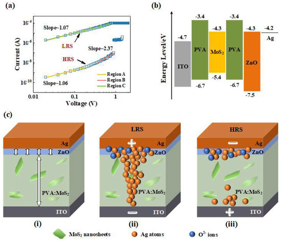 According to the above discussion, which demonstrates the device is a CFs-type memory, a nonvolatile resistive switching model has been proposed to analyze the RS phenomena of the Ag/ZnO/PVA:MoS2/ITO device as shown in Figure 4b. The initial state of the device is HRS. Then, the conduction behavior of the Ag/ZnO/PVA:MoS2/ITO device follows Ohmic conduction mechanism in the LRS, indicating the formation of a metallic conductive path in the Ag/ZnO/PVA:MoS2/ITO device. When the positive voltage is applied to the top Ag electrode, the Ag loses electrons and would be oxidized into Ag+ ions. Then, the Ag+ ions would migrate toward the ITO electrode under the high external electric field. Finally, the Ag+ ions would be reduced to Ag atoms near the ITO electrode. Once the Ag conductive filament connects the two electrodes with the accumulation of Ag atoms from the top to bottom electrodes, the device would change from HRS to LRS. The existence of ZnO can also lead to the generation of some oxygen vacancies, which is also beneficial for the formation of conductive filaments. However, the conductive filaments in our device are more likely to be Ag filaments [10,25,45,46]. When the voltage polarity is reversed, the Ag conductive filament will break at the weakest point and the device will return to the high resistance state (HRS). Figure 4(cii,ciii) show the schematic presentation of resistive switching mechanism in LRS and HRS, respectively.
