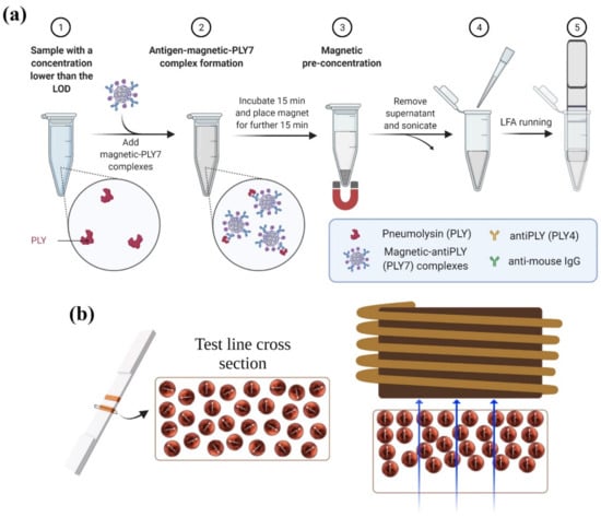 For this work, we developed an LFA to detect PLY with biofunctional magnetic nanoclusters (MNCs) conjugated to an anti-PLY antibody. The polyol solvothermal synthesis method was optimized for reproducible and scalable production, yielding MNCs with large initial magnetic susceptibility and high magnetic moment. A considerable improvement in the LFA’s sensitivity was achieved thanks to the multifunctionality of the MNCs. First, magnetic preconcentration and relocation decrease the detection limit. Second, MNCs enable dual detection: optical (the test line has a brownish color) and magnetic (detectable, for example, with an inductive sensor).