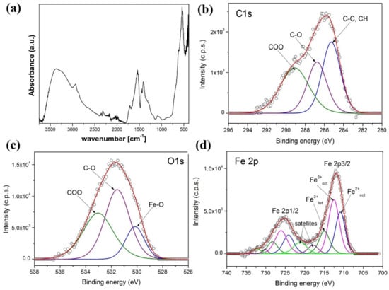 (a) FTIR spectrum of the magnetic nanoclusters coated with polyacrylic acid. (b) The high-resolution XPS spectra of C 1s, (c) O1 s, and (d) Fe 2p core-levels for the clusters coated with polyacrylic acid.