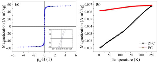 DC magnetization measurements were performed using a vibrating sample magnetometer (Cryogenic Ltd., London, UK). Zero field cooling (ZFC) and field cooling (FC) curves were obtained using a Quantum Design SQUID magnetometer (Quantum Design, San Diego, CA, USA). Zero-field-cooled () and field-cooled () magnetization measurements were carried out by cooling the sample from room temperature to 5 K in zero magnetic field; then, a static magnetic field of 2.5 mT was applied.  was measured during warming from 5 to 300 K, whereas  was recorded during the subsequent cooling. The magnetization values were referenced to the mass of iron oxide measured by thermogravimetric analysis.