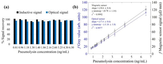 To evaluate the new figures of merit of the technique due to magnetic concentration, we represent on the vertical axis of Figure 8b the obtained signal multiplied by a concentration factor  that considers the relationship between the intermediate and final volumes of the tested samples. This factor is defined as , where  and  are the final (100 μL) and the intermediate volumes, respectively (see Table S1 in Supplementary Materials). This factor allows us to relate the signal obtained with the magnetic and optical methods to the value of the intermediate concentration. The calculated calibration curves with their fitting parameters are shown in in Figure 8b. The LODs have 0.2 ng/mL and 0.6 ng/mL values for the inductive and optical systems, respectively. The new LOQs decreased to 0.7 ng/mL for the inductive sensor and 1.7 ng/mL for the optical one. This means that by taking advantage of the magnetic concentration, it is possible to clearly improve the LOD and LOQ of the system with both methodologies. Further improvement can be expected if the drag force is optimized by a specifically designed array of permanent magnets, as proved in []. These new figures of merit are achieved thanks to the magnetic character of the labels used.