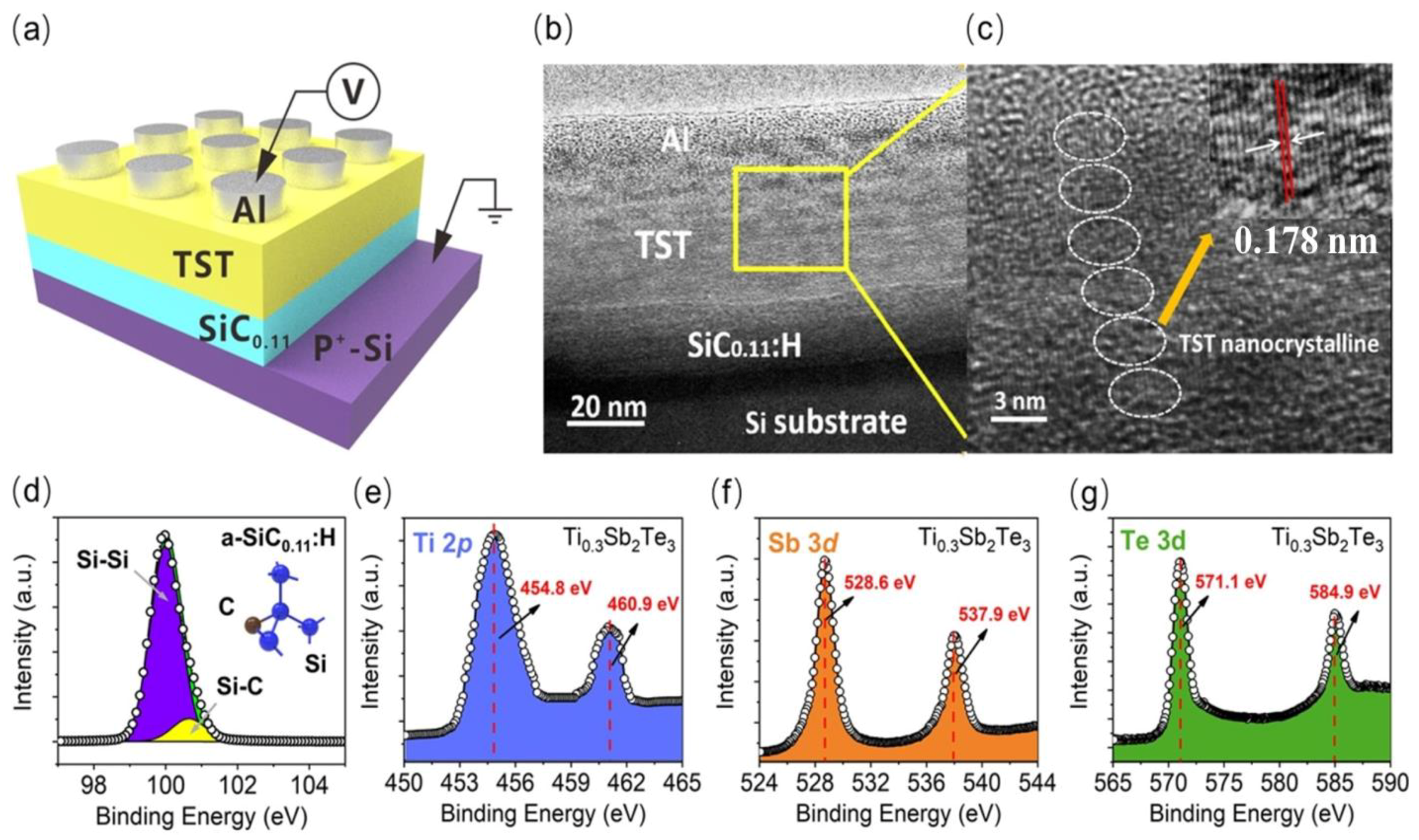 26]. Here, the duration of the DC voltage in our set, and the reset progress, was ms, which could produce enough Joul heat to make the TST films transform from the amorphous state to the crystalline state. Therefore, the TST dot remained in the crystalline state, which ensured that the TST nanopathway could not be ruptured in the following cycles. The composition analysis of the TST/a-SiC