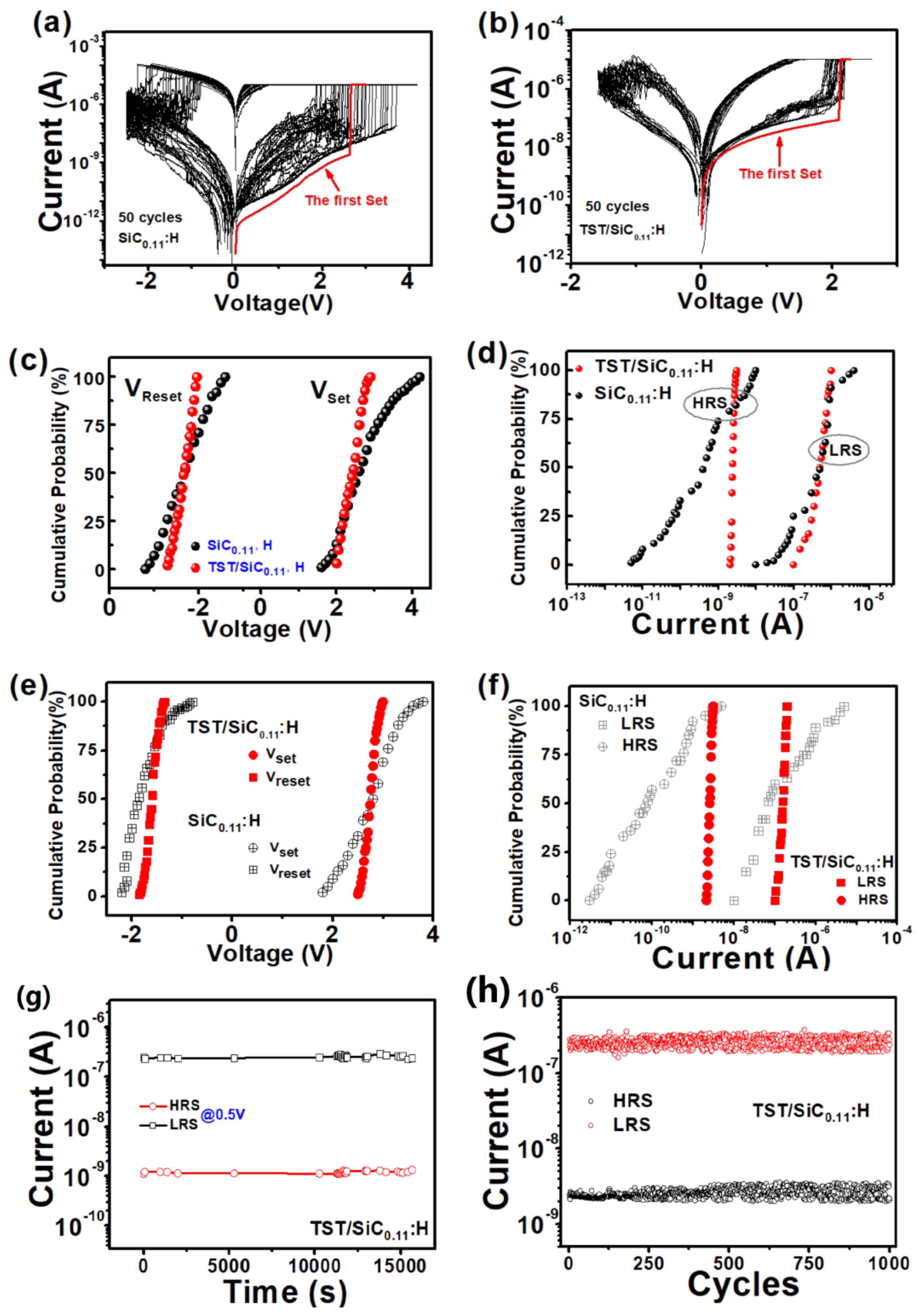 0.11:H memristors was reduced by 93.6% and 86.3%. The retention and the endurance characteristics of the TiSbTe/a-SiC