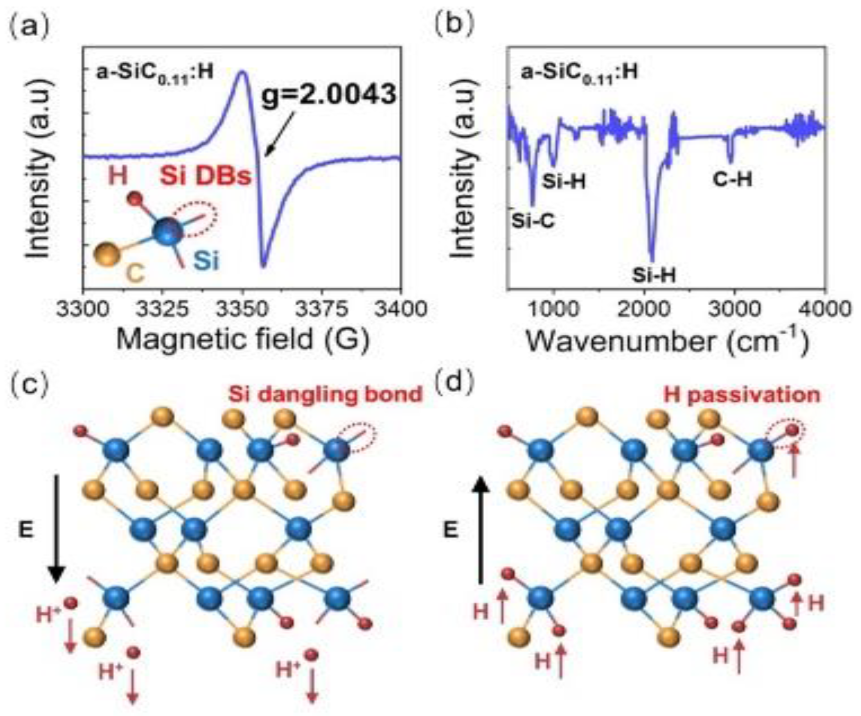 0.11:H films in their initial state. As the Si-C bond energy (3.7 eV) and the C-H bond energy (4.2 eV) was higher than that of the Si-H bond (3.0 eV), the Si-H bonds were easier to break, which generated Si dangling bonds under the electric field. As displayed in