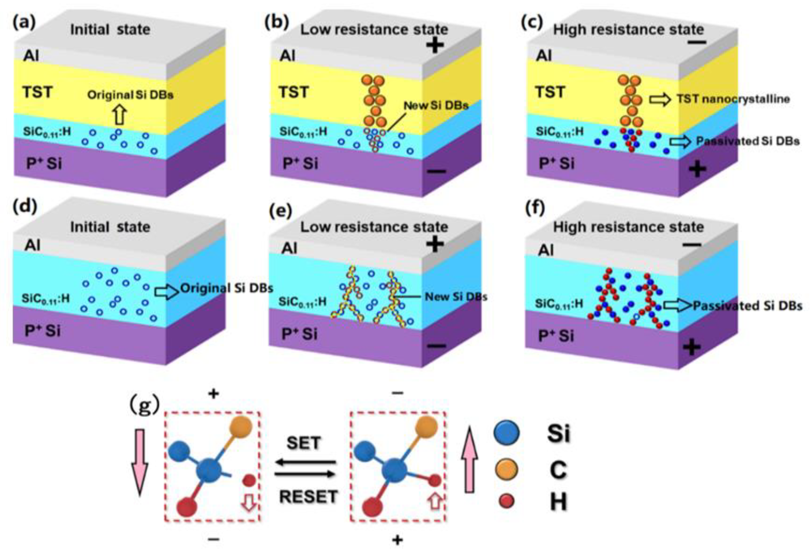 Figure 3c, Si DBs were produced, as the Si-H bonds could be broken under the positive electric field, and hydrogen ions migrated towards the negative cathode. When the number of Si DBs reached a high level, a filament of Si dangling bonds was formed, causing the device to switch from an HRS to an LRS. Under negative bias, the migration of H