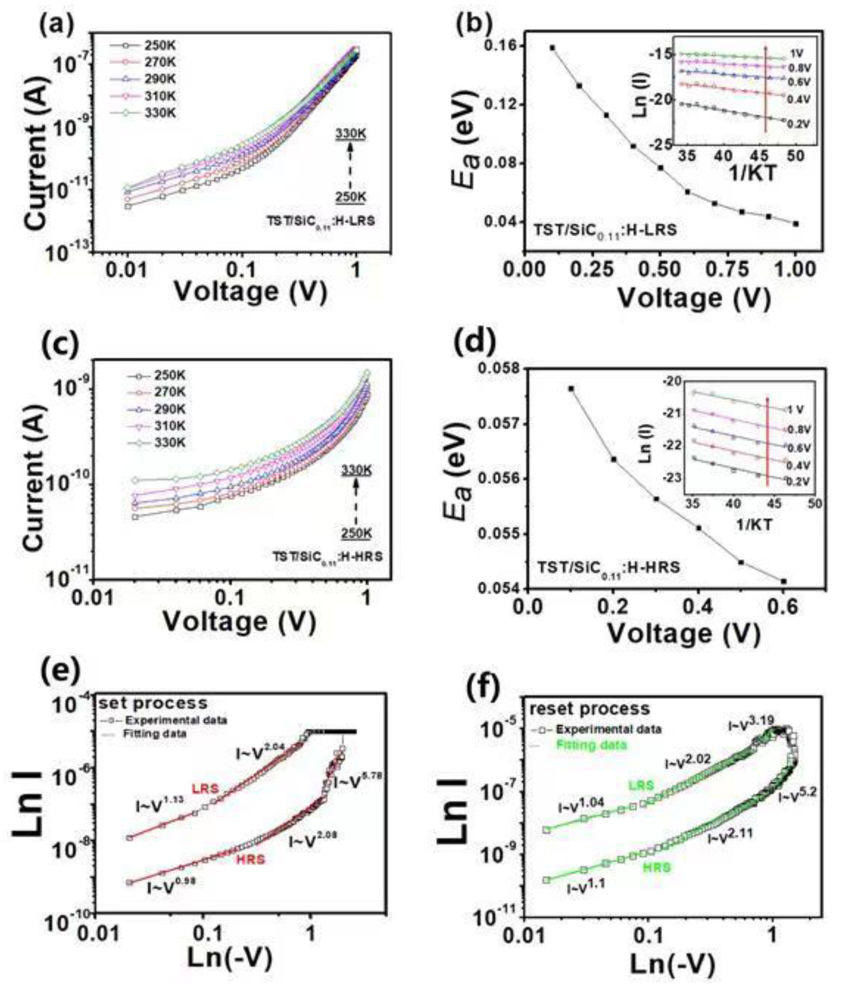 31]. The I-V characteristic curves of the HRS and the LRS were replotted in double logarithmic scales for illustrating the set process and reset process in the Al/TST/a-SiC