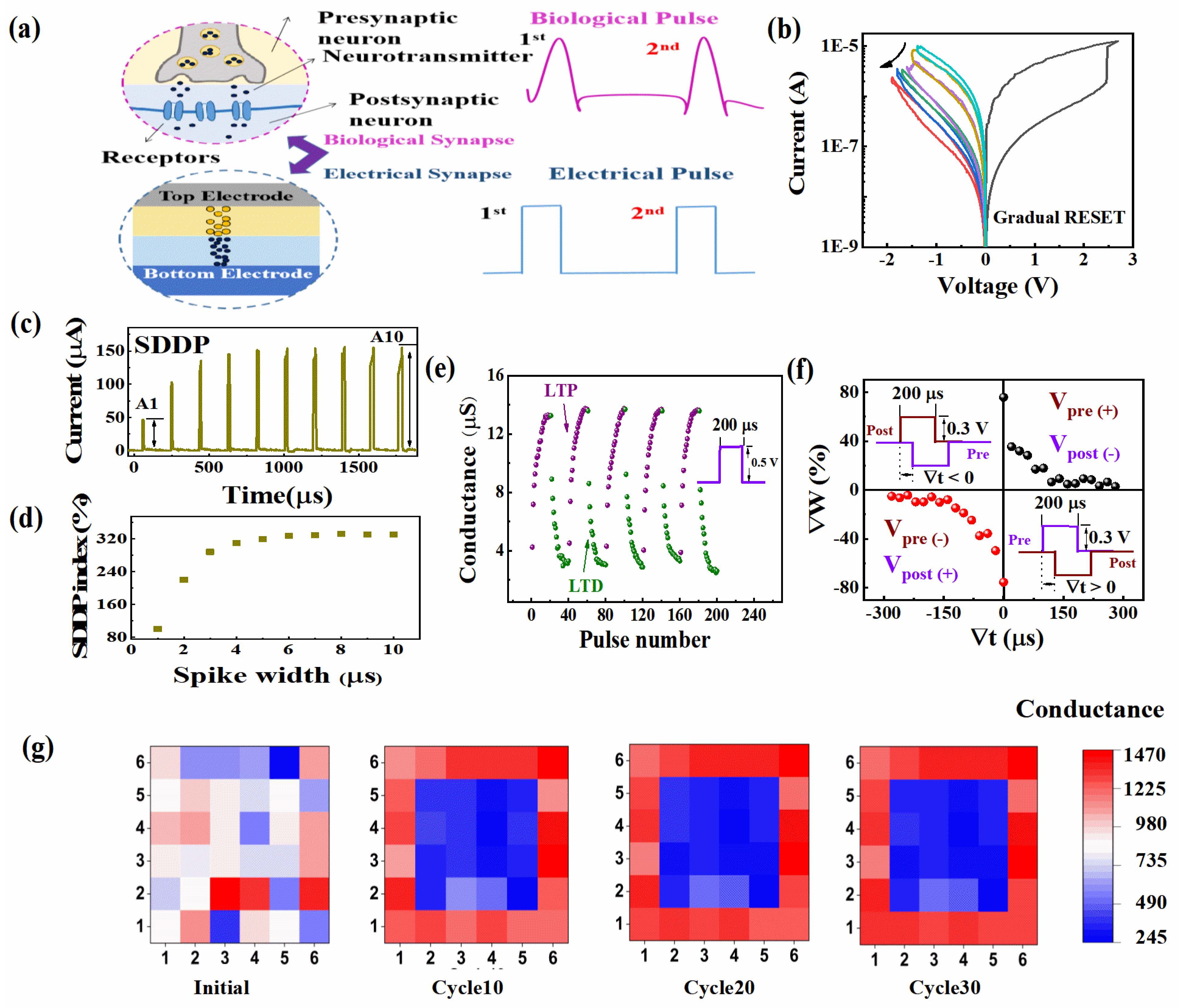 Figure 6f. In accordance with the learning rule, when the pre-spike preceded/lagged behind the post-spike, the connection strength of the synapse between the two neurons was reinforced/weakened. It can be seen that a larger conductance change was caused by a closer spike timing, which was consistent with the Hebbian learning rule. In order to visualize the information handling in the TiSbTe/a-SiC