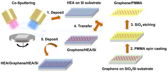 As shown in Figure 1, there are overall five steps to fabricating a NL CoCrFeNi/graphene composite. First, the magnetron co-sputtering technique was employed to correspondingly deposit 625 nm thick CoCrFeNi HEA film on the (100)-oriented Si wafers at room temperature. The film thickness was regulated by working time when other sputtering parameters were kept constant. The working distance between the target and Si wafer was ~90 mm. The sputter power was set at 30 W. The argon flow (99.99%) was controlled and fixed at 20 sccm (standard cubic centimeter per minute), while the working pressure was set as 0.3 Pa. The rotation speed was 30 rpm (rotation per minute) for the homogeneous deposition. Second, chemical vapor deposited monolayer graphene on SiO2/Si substrate (6Carbon Technology, Shenzhen, China) and was spin-coated with poly-(methyl methacrylate) (PMMA) as the protective layer, followed by heating at 180 °C for one min—curing. Third, the SiO2/Si template was etched away by KOH solution (1 mol/L) at 90 °C. Subsequently, the freestanding graphene supported by PMMA was released into distilled water three times to remove the KOH solute. Fourth, the graphene with PMMA coating was transferred to the as-prepared 625 nm thick CoCrFeNi HEA film on Si substrate and then left in a dry (40% relative humidity) cabinet overnight at 25 °C so that the graphene attached firmly to the HEA film. Finally, the PMMA layer was removed after immersing in acetone, and the ~1250 nm thick CoCrFeNi/graphene composite was fabricated, followed by, again, deposition with the same parameters as in the first step.