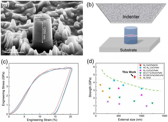 Illustration of (a) as-fabricated NL HEA/graphene micropillar; (b) the uniaxial micro-compression mechanical testing; (c) uniaxial compressive stress–strain curves of NL HEA/graphene micropillars; (d) the strength vs. the external size of the NL HEA/graphene micropillar compared with other related materials, including nanocrystalline (NC) Al0.1CoCrFeNi HEA film pillar, NL CoCrFeNi/Cu micropillar, single crystalline (SC) [111]-orientated AlCoCrFeNi HEA pillar, SC [001]-orientated FeCoNiCuPd HEA pillar, and NL Ni/graphene pillar.