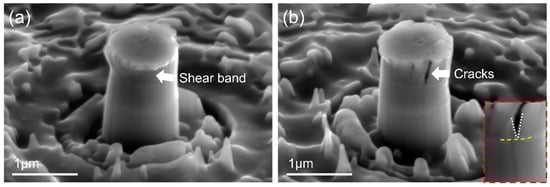 To reveal the underlying deformation and fracture behaviors, postmortem SEM observations were performed on the NL HEA/graphene micropillar after micro-compression testing. A representative SEM image of the NL micropillar displayed a localized shear deformation at the upper part of the HEA that yielded at 20% compressive engineering strain, as shown in Figure 5a. The side view of Figure 5b shows a few large cracks propagating along the compressive axis. It is worth mentioning that the propagation of a large crack was arrested at the graphene interface, which is evident in the enlarged image in Figure 5b. The cracking and shearing events are captured well with minor stress fluctuations in the stress–strain curve in Figure 4c.