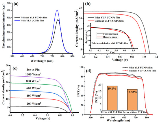 (a) Shows the photoluminescence spectra of perovskite films in PSCs with and without UC thin-film coating. (b) J-V characteristic curves measured under AM 1.5 G for fabricated PSCs with and without UC thin films. (c) A comparison chart of power conversion efficiency (PCE) of fabricated UC-PSC device and pristine device. (d) Quantum efficiency (IPCE) spectra of fabricated PSCs with and without UC thin films.