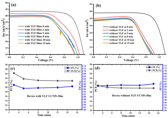 Without an appropriate cooling system for the UC-PSC device, the dark current increases as a function of the operating temperature, resulting in reduced open-circuit voltage (Voc) for longer times, and therefore reducing the photovoltaic performance of the system [28,29], as illustrated in Figure 4a,c. In comparison to the UC-PSC device, the pristine device shows a relatively low photovoltaic performance, as illustrated in Figure 4b,d. The good photovoltaic performance of the UC-PSC device could be attributed to the better conversion efficiency of the more concentrated incident NIR photons to visible light photons. In addition, the Li-doping in the UC layer may enable a faster electron transport within the layers of the PSCs.