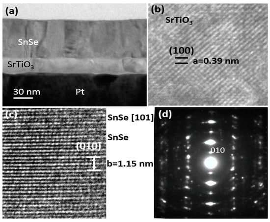 The microstructure of the SnSe/STO/Pt heterostructure was characterized by a cross-sectional TEM study and the results are shown in Figure 2. The contrast in Figure 2a suggests that both the SnSe and STO layers are polycrystalline in microstructure, and the thicknesses of the SnSe and STO layers were determined to be about 90 and 30 nm, respectively. It is apparent that the SrTiO3 (STO) layer has a perovskite structure, as shown in Figure 2b, where the unit cell of STO can be identified and a lattice constant of a = 0.39 nm can be determined. Some areas of the polycrystalline SnSe layer presented a [10] preferred growth direction, and Figure 2c,d depict a typical HRTEM image and electron diffraction pattern along a zone axis close to the [101] direction. Electron dispersive x-ray (EDX) spectra (not shown) of both layers revealed nearly a 1:1 ratio of Sr:Ti and Sn:Se, suggesting stoichiometry of the deposited STO and SnSe layers.
