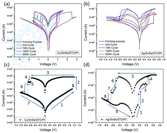 To analyze the switching mechanism, I–V curves of the switching process of both the Cu and Ag devices were measured, and the results are shown in Figure 3c,d. It is apparent that the switching process of the Cu/SnSe/STO/Pt device can be divided into seven steps. However, the switching process of the Ag/SnSe/STO/Pt device is much more complicated and contains nine steps. According to reference reports, an important aspect of metal oxide materials is the migration of oxygen vacancies (or oxygen ions) under an applied electrical field [9,10,11,12,22,43,44]. Based on the investigations from former studies, the switching mechanism in our devices should be mediated by the forming and rupture of the conductive filament. This active medium is actually much smaller than the cell size, which allows for a potential of scaling. When the positive voltage sweep is applied on both the Cu and Ag-electrode devices, oxidation occurs on the Ag and Cu top electrode since both are electrochemically active metals. Therefore, volatile Cu+ and Ag+ cations could form as Cu → Cu2+ + 2e− and as Ag → Ag+ + e−. These volatile cations migrate toward the Pt electrode through the SnSe layer and STO layer and are finally reduced by electrons flowing from the cathode (i.e., Cu2+ + 2e− → Cu and Ag+ + e− → Ag. Meanwhile, when negative voltage sweeps were applied, Cu ions and Ag ions can migrate back to the top electrode in the same way.