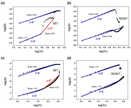 We also created double logarithmic plots of I–V curves in both the positive voltage sweeps and negative voltage sweeps, as shown in Figure 4. One can see that during the SET process, as shown in Figure 4a,c, thermally generated carriers were dominant over the electrode-injected carriers in the ohmic conduction regime (I∝V) at low voltage. Then, the slope increased to the second regime (I∝V3) when the traps in SnSe/STO were all filled out by the carriers due to the further increase in the voltage. There were two distinctive regimes with different slopes in the SET process for both the Ag and Cu TE devices, which can be explained by the space charge limited conduction (SCLC) model. After the SET process, both devices were switched from HRS to LRS. As shown in Figure 4b,d, the double logarithmic plots of the I–V curves in the RESET process of both the Ag and Cu TE devices were also well-fitted with a slope of about 1, suggesting an ohmic conduction behavior. This good fit indicates that Ag ion-based bridge filaments and Cu ion-based bridge filaments are formed in the SnSe/STO heterostructure switching medium, where the current paths generated by filaments are metallic.
