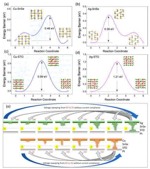 To better understand the diffusion path and the energy barrier for Cu and Ag ions into the SnSe and STO layers, density-function theory (DFT) calculations were carried out. As shown in Figure 5a,b, SnSe provided a faster diffusion channel for both the Cu and Ag ions as the energy barriers were 0.46 eV for the Cu ions and 0.38 eV for the Ag ions, respectively, which were much lower compared to that in STO. The energy barrier for the Ag ion diffusion in STO layer was 1.21 eV, which is relatively higher than that of the energy barrier for Cu ion, which was 0.99 eV, as shown in Figure 5c,d. This result supports the fact that Ag, as the top electrode, can archive more resistance states in the SnSe/STO heterostructure because the relatively higher energy barrier in STO helps to stabilize the intermediate states by delaying the filament rapture process. Since the LRS of devices is the initial state to achieve multistate and the time it takes for a voltage pulse to reach the middle state is approximately 1–5 µs [23], the filament in the SnSe layer and STO layer cannot migrate back to the top electrode completely in such a short time [22,47,48,49,50]. The filament rapture process continues at the SnSe/STO interface under increased negative voltage pulses on the top electrode, leading to a further change in the resistance state of the device. Therefore, this delayed process increases the possibility of forming more resistance states when negative voltage pluses are applied on the device to rupture the filament [13]. Figure 5e depicts the potential switching mechanisms of the formation and rupture of the conductive filament for the Cu and Ag electrode devices [51,52]. These intermediate states demonstrate that the devices are both resistive switching memories and memristors.