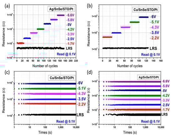 The stability of different resistance states was confirmed by the endurance test for 25 cycles of positive voltage sweeping and the negative voltage pulses to SET and RESET the devices, as shown in Figure 6a. For the Cu/SnSe/STO/Pt device, five high resistance states were found to be 1.12, 5.33, 9.65, 21.54, 43.37, and 87.72 kΩ at the RESET voltage pulse when sweeping from −2.2 V to −6 V. For the Ag/SnSe/STO/Pt device shown in Figure 6b, there were seven high resistance states from 1.05, 2.26, 5.53, 9.92, 23.55, 45.72, to 92.63 kΩ at RESET voltage pulses from −1.7 to −6.6 V.