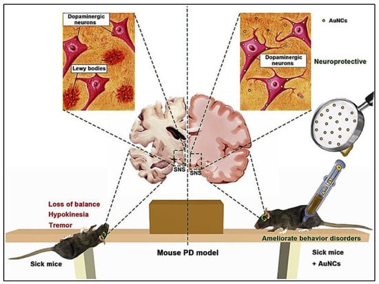 - Gao, G.; Chen, R.; He, M.; Li, J.; Wang, L.; Sun, T. Gold nanoclusters for Parkinson’s disease treatment. Biomaterials 2019, 194, 36–46. [Google Scholar] [CrossRef]
