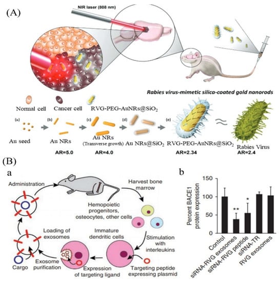 (A) Rabies virus mimicking silica-coated gold nanorods bypass the BBB via neuronal pathways to treat brain disease. (B) Delivery of therapeutic siRNA to the mouse brain by systemic injection of exosomes. (a) Schematic illustration of the preparation of exosomes; (b) gene silencing efficiency by different vehicles. Adopted from Wang et al., 2020 [].