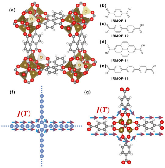 Atomistic structures of the MOFs and MOF building blocks investigated in this work: (a) IRMOF-1, (b) 1,4-benzenedicarboxylic acid to form IRMOF-1, (c) biphenyl-4,4′-dicarboxylic acid to form IRMOF-10, (d) pyrene-2,7-dicarboxylic acid to form IRMOF-14, and (e) terphenyl-4,4′’-dicarboxylic acid to form IRMOF-16. (f) Two-dimensional slice of the atoms in a node and its neighboring linkers for a model system with easily adjustable linker length. The system is designed such that its heat transport pathways for the heat flux, J(T), are similar to real Zn4O-based MOFs, like those in IRMOF-1 (g). Colors representing the different atom types: Zn—brown, C—grey, H—white, O—red, model “atoms”—light blue.