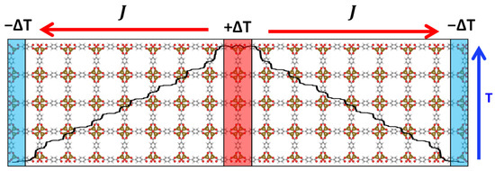 Schematic representation of a non-equilibrium molecular dynamics (NEMD) simulation (employing periodic boundary conditions). Two regions of the simulation box are connected to two thermostats at temperatures T ± ΔT, where T is the temperature at which the thermal conductivity is calculated. A heat flux J emerges from the hot to the cold thermostat. There is a discernable fine structure in the temperature profile with terraces at the positions of the nodes and linkers and steps at their interface.