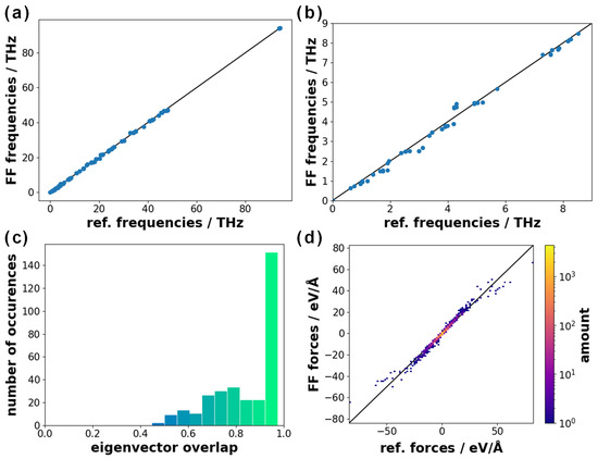 Overview of the performance of the force field for IRMOF-1 compared to the DFT reference for various observables: comparison of vibrational frequencies at Γ for (a) the entire frequency range and (b) for the low-frequency modes below 9 THz; (c) histogram showing the dot product overlap of eigenvectors at Γ; (d) 2D Histogram with a 100 × 100 bin grid comparing the Cartesian forces on all atoms for a set of 30 randomly displaced geometries.