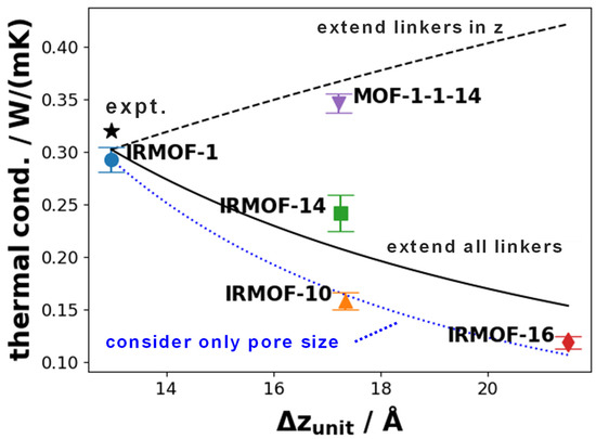 Finally, when completely disregarding the details of the atomistic structure of the MOFs, the only impact of the linker length in an isoreticular MOF should be a decrease in the thermal conductivity due to the increasing unit-cell and pore cross-section. In this case, one would expect a drop of with , as then only the impact of in Equation (7b) prevails. This situation is depicted in Figure 4 as a dotted blue line. In fact, such an evolution has previously been suggested in the literature as a consequence of increasing the linker lengths based on model MOFs [45] (for a visualization of the thermal conductivity values as a function of the inverse pore cross-section, see Figure S14 in the Supplementary Materials).
