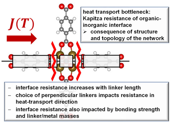 Metal–organic frameworks (MOFs) [1,2,3] are materials that have attracted substantial interest in the scientific community over the past two decades. They consist of inorganic nodes connected by organic linkers, forming highly porous structures. The multitude of possible configurations of the nodes and the diversity of potential linker structures lead to an unlimited number of conceivable materials with various degrees of porosity and a vast range of properties. In fact, there are already over 100,000 different MOF structures in the Cambridge Crystallographic Data Centre database [4,5]. Many potential applications of MOFs try to exploit their very high internal surface area or their adaptability through suitably arranging the building blocks. Some examples include gas storage [6,7], gas separation [8,9], catalysis [10,11,12,13], drug delivery [14,15], or electronic devices [16,17,18]. These applications often involve processes that generate heat, which needs to be dissipated. This can become a major bottleneck for large-scale implementations of MOFs, as they feature extremely low thermal conductivities [19,20,21]. For example, in the absence of heat dissipation, a significant increase in temperature (from 50 to 200 K) has been predicted for CO2 or CH4 adsorption in MOFs [19]. The use of MOFs for hydrogen storage in fuel cell applications [22,23,24,25] is also challenged by their low thermal conductivities, as efficient heat transport is crucial for maintaining effective operating conditions [26]. At the other end of the spectrum, the poor thermal conductivity of MOFs can be beneficial in ensuring effective thermoelectric energy conversion [27,28,29]. To design MOFs with the required properties, it is important to understand how structural modifications influence thermal conductivities.