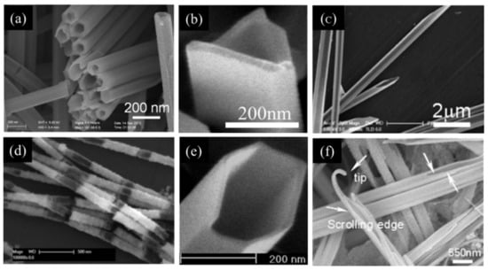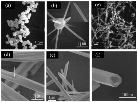 SEM images of five Te NTs samples collected after hydrothermal treating for (a) 5 h, (b) 8 h, (c,d) 12 h, (e) 16 h, and (f) 20 h, supporting the NDRG mechanism. Reprinted with permission from []. Copyright 2004, American Chemical Society, Washington, DC, United States.