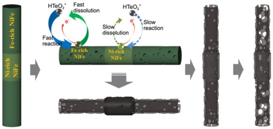 Schematic diagram of the bamboo-shaped Te NTs produced by the galvanic displacement reaction of a segmental NiFe nanowire with Ni-rich and Fe-rich NiFe segments in an electrolyte consisting of HTeO2+ ions in acidic HNO3 solution. Reprinted with permission from []. Copyright 2014, Wiley-VCH Verlag GmbH & Co. KGaA, Weinheim, Germany.