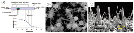 (a) Schematic diagram of experimental device for preparation of Te nanotubes by physical vapor deposition shows gas flow arrangement in tubular furnace. Different temperature zone in the furnace along the flow of the gas is also shown. (b) SEM of Te nanotubes growing radially from Te sphere in the temperature zone of 200 °C. (c) SEM image of Te microrods grown in the temperature zone of 400–350 °C. Reprinted with permission from []. Copyright 2008, American Chemical Society, Washington, DC, United States.