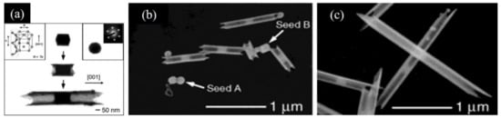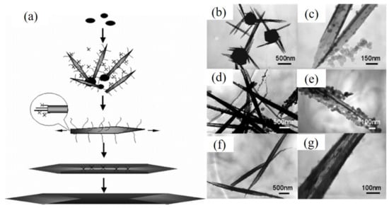 (a) The SG mechanism for the formation of shuttle-like Te NTs using serine as additive. (b–g) TEM images of Te NTs obtained at different stages: (b) and (c) 2 h, (d) and (e) 4 h, (f) and (g) 12 h. Reprinted with permission from []. Copyright 2005, American Chemical Society, Washington, DC, United States.