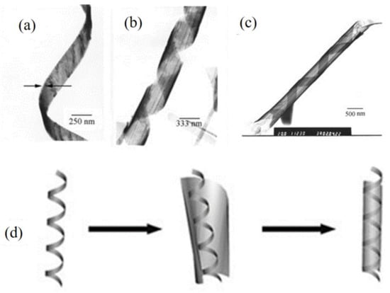 (a–c) Representative TEM images of the as-synthesized Te NBs and NTs, showing their geometric shapes. (a) Twisted Te nanobelt. (b) Helical nanobelt, displaying the helical twisting property of the NBs. (c) A typical belt-rolled Te nanotube. (d) Schematic illustration of the proposed HBT mechanism. Reprinted with permission from []. Copyright 2002, WILEY-VCH Verlag GmbH & Co. KGaA, Weinheim.