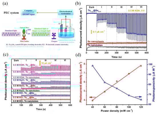 (a) A typical photoelectrochemical system built for evaluating the photoresponse behavior of the Tex@Sey-based photodetector in electrolytes. (b) Self-powered photoresponse behaviors of Te NTs, Se nanosheets, and Te0.37@Se0.63 in 0.5 M KOH under simulated light. (c) Size effect of Se on Te NTs on the photoresponse performance of Tex@Sey-based photodetector under simulated light in 0.5 m different electrolytes. (d) Fitting curve of Pph and calculated photoresponsivity (Rph) of Te0.37@Se0.63 under simulated light with various power densities in 0.5 M KOH. Reprinted with permission from []. Copyright 2007, WILEY-VCH Verlag GmbH & Co. KGaA, Weinheim.