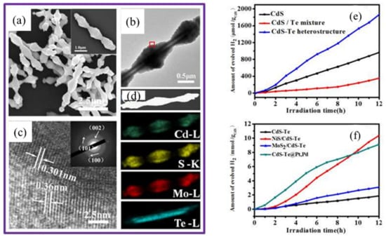 (a–d) MoS2/CdS-Te sample characterized with (a) SEM, (b) TEM, (c) HRTEM of the area marked with a square in (b) (the inset showing the corresponding SAED pattern), and (d) STEMEDS elemental mapping, showing the Cd (celadon), S (yellow), Mo (red), and Te (wathet). (e,f) Comparison of the photocatalytic activities of (e) CdS, CdS/Te mixture, and CdS-Te heterostructure, respectively; and (f) CdS-Te, NiS/CdS-Te, MoS2/CdS-Te and CdS-Te@Pt, Pd, respectively, in a lactic acid aqueous solution under visible light illumination. Reprinted with permission from []. Copyright 2015, American Chemical Society, Washington, DC, United States.