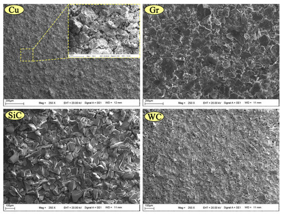 Pure copper with an average particle size of 45–75 µm was used as a matrix material in the production of composites. To increase the wear performance, Gr powder with an average particle size of 44 µm was added to the matrix at a fixed rate (6 wt.%); the powder is known to have lubricating properties. Figure 1 shows SEM graphs of the dust particles used in the experiments. It is known that graphite powders added to copper reduce mechanical properties [27]. To improve the mechanical properties, Cu-6Gr/SiC-WC compacts were prepared by adding SiC and WC reinforcement powders at different rates into Cu-6Gr powders. Some properties of the powder particles used are shown in Table 1. In Table 2, the mixing ratios of the selected powder particles are given.