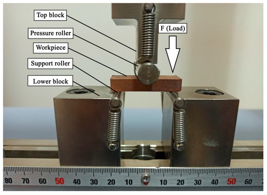 In this equation, : bending stress (MPa), F: applied load (N), L: the distance between the two supports (mm), b: width of the sample (mm), and d: thickness of the sample (mm). Figure 2 shows the photograph of sample C1 during the three-point bending test.