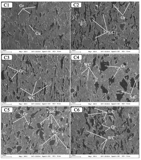The SEM photographs of Cu-6Gr/SiC-WC composites produced by hot pressing using the powder metallurgy method are shown in Figure 4. Large amounts of Gr, SiC, and WC particles are visible as dark-coloured regions in composite structures. As shown in the SEM graphs, the SiC particles in the structure led to the uniform distribution of WC in the composite samples [29]. According to the images obtained from the surface photographs of the composites, it can be said that the reinforcements exhibit a good distribution within the structure. No voids or cracks were observed on the surfaces as a result of sintering by hot pressing. In addition, a non-porous and dense structure was observed in the hybrid composites. It is seen that the graphite has a tail-shaped aspect in the structure. SiC and WC particles used as reinforcements are also seen embedded in the matrix structure. In addition, the matrix and hybrid reinforcements were found to have a good interfacial bond. A good interface and homogeneous dispersion are required to increase tribological performance [30].