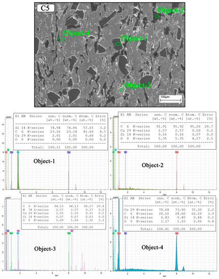 Figure 5 shows the SEM/EDS analysis taken from the surface of hybrid reinforced (Gr–SiC–WC) copper composite samples. The region indicated by object 1 represents SiC, the region designated as object 2 is Gr, the region indicated by object 3 is WC, and the region indicated by object 4 represents a mixed copper-rich region. Thus, the existence of graphite and hybrid reinforcements in the composite structures is confirmed. In addition, the atomic weights of the particles in the EDS areas were given in the form of a table. Meher and Chaira [31] produced Cu–Gr/SiC composites by powder metallurgy method. As a result of their EDS analysis, they examined the quantitative analysis of three different phases. They reported that the highest peaks were Cu, C, and Si elements.