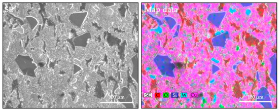 To determine the existence and dispersion of particles within the composite structures, a component mapping analysis was done (Figure 6). The copper matrix is represented by the pink-coloured areas, the graffiti by the red-coloured areas, the silicon carbide by the dark blue coloured areas and the tungsten carbide by the blue coloured areas. Particles whose existence was proven by EDX analysis were coloured by elemental mapping.
