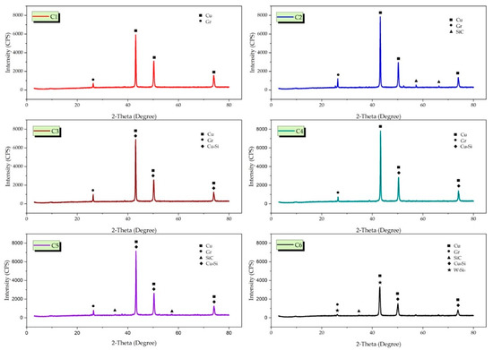 Figure 7 and Supplementary File shows the X-RD patterns of Cu-6Gr/SiC-WC composites produced by hot pressing. The characteristic peaks of copper are generally seen in the X-RD model. Due to the low sintering temperature (850 °C), SiO and CuO did not form, and no peaks were found as a result of the analysis. This is one of the superior aspects of hot pressing. In X-RD analysis, Cu, Gr (C), SiC, Cu9Si (silicon copper) and W5Si3 (silicon tungsten) phases were detected in composite structures. It is seen that the peak intensity decreases in some samples with the addition of reinforcement particles. This decrease is attributed to the thermal expansion coefficient between the Cu matrix and the secondary phase SiC particles. A similar study supports this opinion [32]. Powder particles used at the micro-level by hot pressing have little effect on grain growth. At the same time, hybrid supplements significantly reduce grain growth with a homogeneous distribution [33]. Silicon carbide powder particles enter the copper grain boundaries, fixing them, and preventing grain growth [34].
