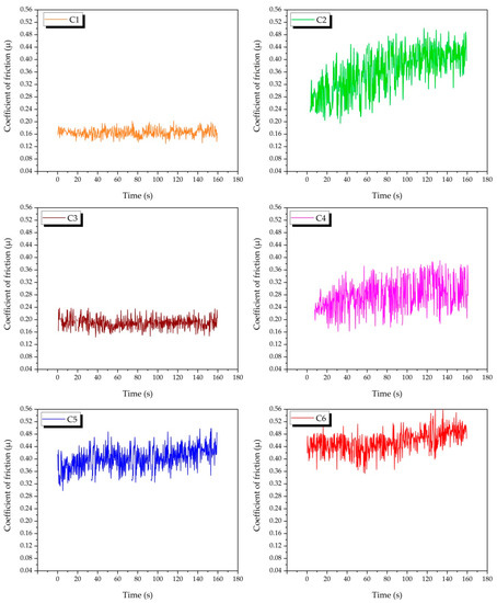 Time-dependent variation of the coefficient of friction of composite samples.