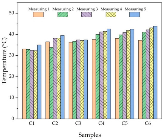 Figure 15 represents the temperature graph generated during the wear tests. Temperatures were recorded by measuring every 200 m of wear distance. When the graph is inspected, it is clear that the rising temperatures are directly proportional to the reinforcement ratios. It was observed that the temperature also increased in each measurement interval. The highest temperature was recorded as 41.4 °C in sample no C6 (Cu-6Gr/3SiC-3WC). The fact that the C6 sample has the highest average friction coefficient supports this situation (highest temperature). As the friction coefficient increases, the temperature also increases.