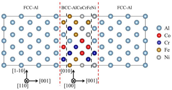 In previous studies, the lattice parameters for the b.c.c AlCoCrFeNi HEA and f.c.c Al were determined to be 2.89 ± 0.05 Å [29] and 4.059 Å [30], respectively. In order to accommodate the lattice mismatch at the Al/AlCoCrFeNi interfaces, the (001)fcc-Al|(001)bcc-HEA interface that aligned along [110]fcc-Al/[100]bcc-HEA and [1–10]fcc-Al/[010]bcc-HEA, was built. Here, a configuration consisting of six b.c.c structured atomic layers of HEA (Al20Co19Cr19Fe19Ni19 with 96 atoms) and twelve f.c.c. structured aluminum layers (with 192 Al atoms) were used as the supercell for first-principles calculations, as shown in Figure 1. The HEA configurations were generated with an SQS method, which was compiled within the framework of ATAT software [31]. There were totally 26 configurations of supercells that had been utilized to simulate the chemical disorder in HEA.