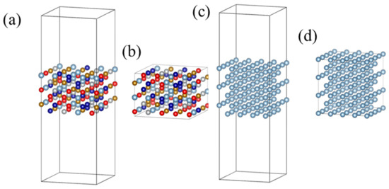 To evaluate the interfacial stability, the free energy of interface between the HEA layers and aluminum layers was also computed. The model of HEA with free surfaces was generated by removing the Al atomic layers in the supercell shown in Figure 1, and then, the HEA slab with (001) surfaces that consists of the remaining six HEA layers and the vacuum layers about 24 Å in thickness was obtained, as shown in Figure 2a. Further, the bulk model for HEA was obtained by removing the vacuum layers, as shown in Figure 2b. For the Al slab with (001) surfaces, six atomic layers stacked along [001] direction were constructed, and the vacuum layers with a thickness of about 26 Å were added, as shown in Figure 2c; and the bulk Al was constructed by removing the vacuum layers, as shown in Figure 2d.