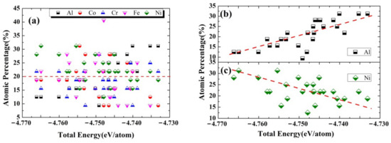 Figure 3 indicates that the Al/AlCoCrFeNi interfaces become more stable or the interaction between the atomic surface layers of HEA and the adjacent Al layer could be stronger, when the Al/AlCoCrFeNi interfaces possess more Ni or less Al atoms. As reported, the electronegativity of Cr, Co, Ni, Fe, and Al atoms are 1.66, 1.88, 1.91, 1.83, and 1.61 [38], respectively, meaning that Ni atoms possess a better ability to attract electrons from the surrounding Al atoms than that of other metal atoms, i.e., the charge transfer between Ni and Al atoms is the strongest, which tends to reduce the total energy of the HEA-reinforced AMCs. Thus, the system with a higher Ni concentration (>20%) in the interfacial regions (the regions between the red and black dash lines in the model system shown in Figure 1 could be more stable in equilibrium, as shown in Figure 3c. Meanwhile, since Al atoms in the matrix and HEA are with the f.c.c and b.c.c crystal structures at their equilibrium states, respectively, the presence of Al atoms at the interfaces will reduce the stability of the HEA-reinforced AMCs. Therefore, when more Al atoms appear at the interface, the HEA-reinforced AMCs could be less stable and possesses high total energy, as shown in Figure 3b.