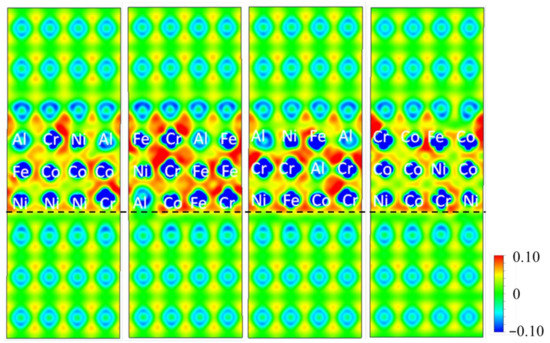 Figure 4 presents four slices of isosurface plots of the differential charge density around the Al/AlCoCrFeNi interface within the cross-sectional area perpendicular to the (001) atomic plane of f.c.c-Al layers, where the atoms in the distorted HEA layers are also indicated. In the plots, the interface between the Al layers and the HEA layers is marked with a black dashed line, as shown in Figure 4. A weak bonding between Al atoms in the HEA layer and Al atoms in the Al layer can be identified since the differential charge density persistent to those Al atoms is close to zero, which is consistent with the above-discussed results that the interfaces with more Al atoms possess high free energy and are unstable. Moreover, it can be also observed that the bonding behaviors between Co, Cr, Fe, or Ni in the HEA layer and the Al atoms in the Al layer present limited difference. It probably results from the sliced planes that are perpendicular to the (001) atomic plane of f.c.c-Al layers, and the centers of those in the severely distorted b.c.c-HEA layers are not shown in the isosurface plots. Therefore, the densities of states (DOS) related to the interface have to be calculated to evaluate the bonding of Al and HEA layers.