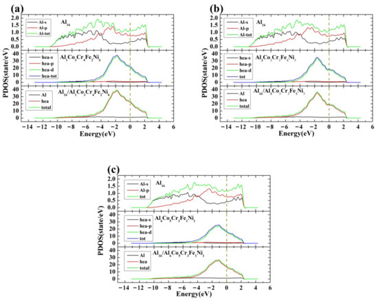 The layer-projected densities of states (LPDOS) that represent the electronic states of different orbitals of atoms in the interfacial regions are further utilized to study the mechanisms of bonding close to the interface between the Al and HEA layers. As revealed in Section 3.1, the concentrations of Al and Ni in the HEA layers play a key role in determining the stability of interface. The LPDOS for the interfacial regions with three different Al (or Ni) concentration gradients are computed, and the results are shown in Figure 5a–c, respectively. It is obvious that the chemical disorder strongly affects the density of states; Also, it can be found the total LPDOS is mainly attributed to the HEA layer, which mostly results from the d-orbitals for the HEA layer. Besides, obvious hybridizations at the energy level of −10~3 eV between p- and d-orbitals for HEA layers and s- and p-orbitals for Al layers are observed. Based on the magnitude of PDOS, one can deduce that the hybridization strength is enhanced with increasing Ni content or decreasing Al content at the interfaces. Moreover, with increasing Ni content or decreasing Al content at the interface, the total PDOS slightly shifts to lower energy levels, which could be mainly attributed to the existence of HEA layers. Therefore, the electronic structure discussed above further demonstrates that there are enhanced interactions between the HEA and Al layers close to the interface where the segregation of Ni or the depletion of Al could lead to better stability of interface.